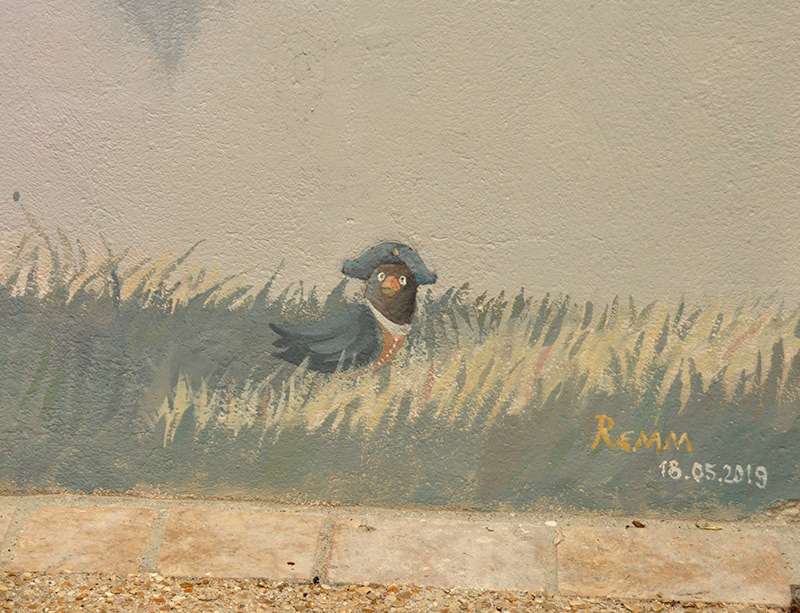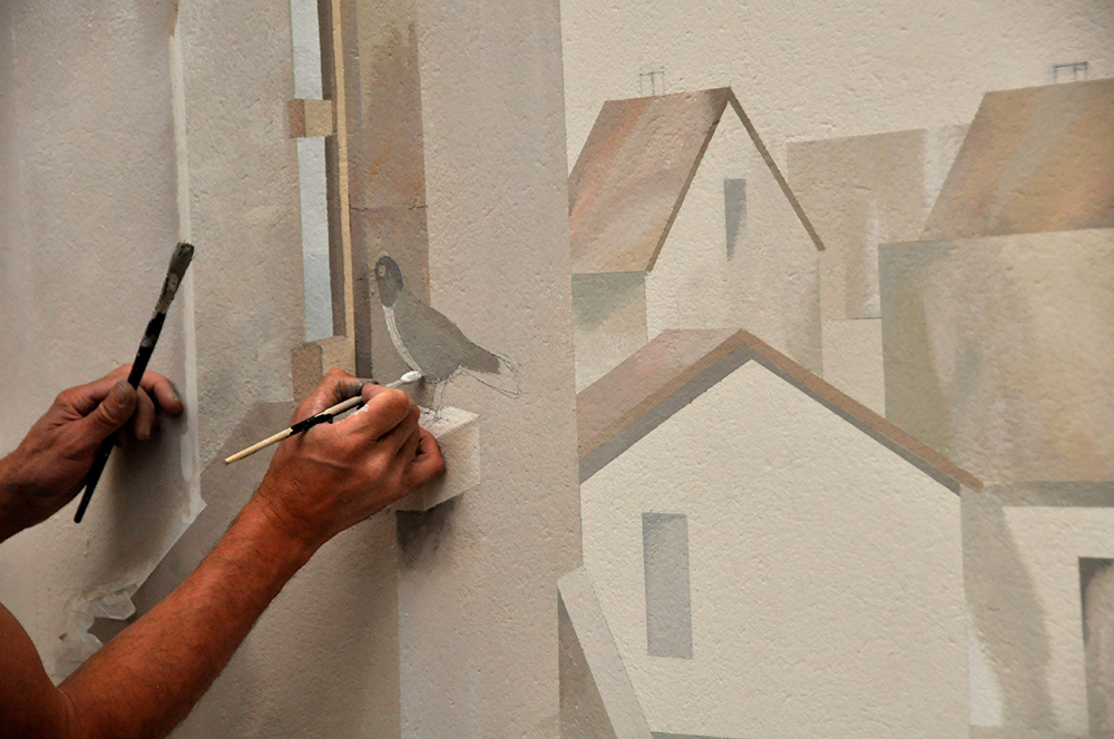Except for the initial wall preparation done by a contractor, I carried out the entire project alone—from concept to completion. The mural was inspired by the remarkable history of the village, once home to Madame de Pompadour’s château and a Dominican monastery.